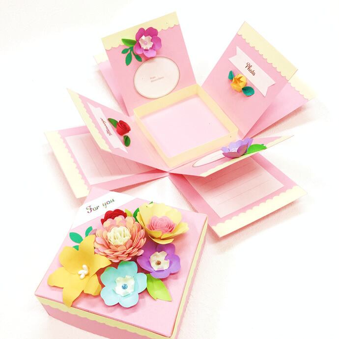 サプライズボックスは、海外では「Exploding Box」と呼ばれるびっくり箱。一見ふつうのギフトボックスのようですが、ふたを開けると箱の部分が展開し、プレゼントと一緒にメッセージや写真があふれ出すという仕掛けです。