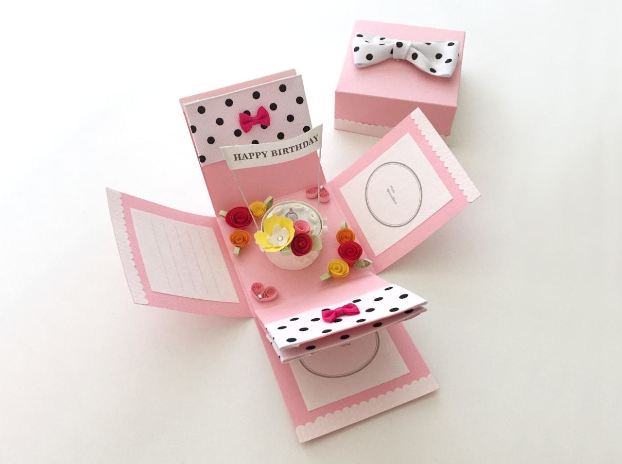 サプライズボックスは、海外では「Exploding Box」と呼ばれるびっくり箱。一見ふつうのギフトボックスのようですが、ふたを開けると箱の部分が展開し、プレゼントと一緒にメッセージや写真があふれ出すという仕掛けです。